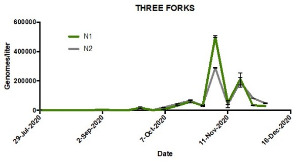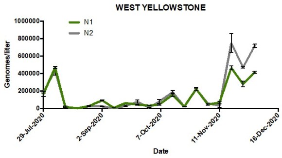Data above show the estimated genomes per liter in wastewater collected from each respective site at weekly intervals. Points indicate mean genomes/liter and error bars are standard error of the mean. Most sites saw spikes in mid-late November, correlating with increasing case numbers in Gallatin County. No data is available for Belgrade prior to November 2020.